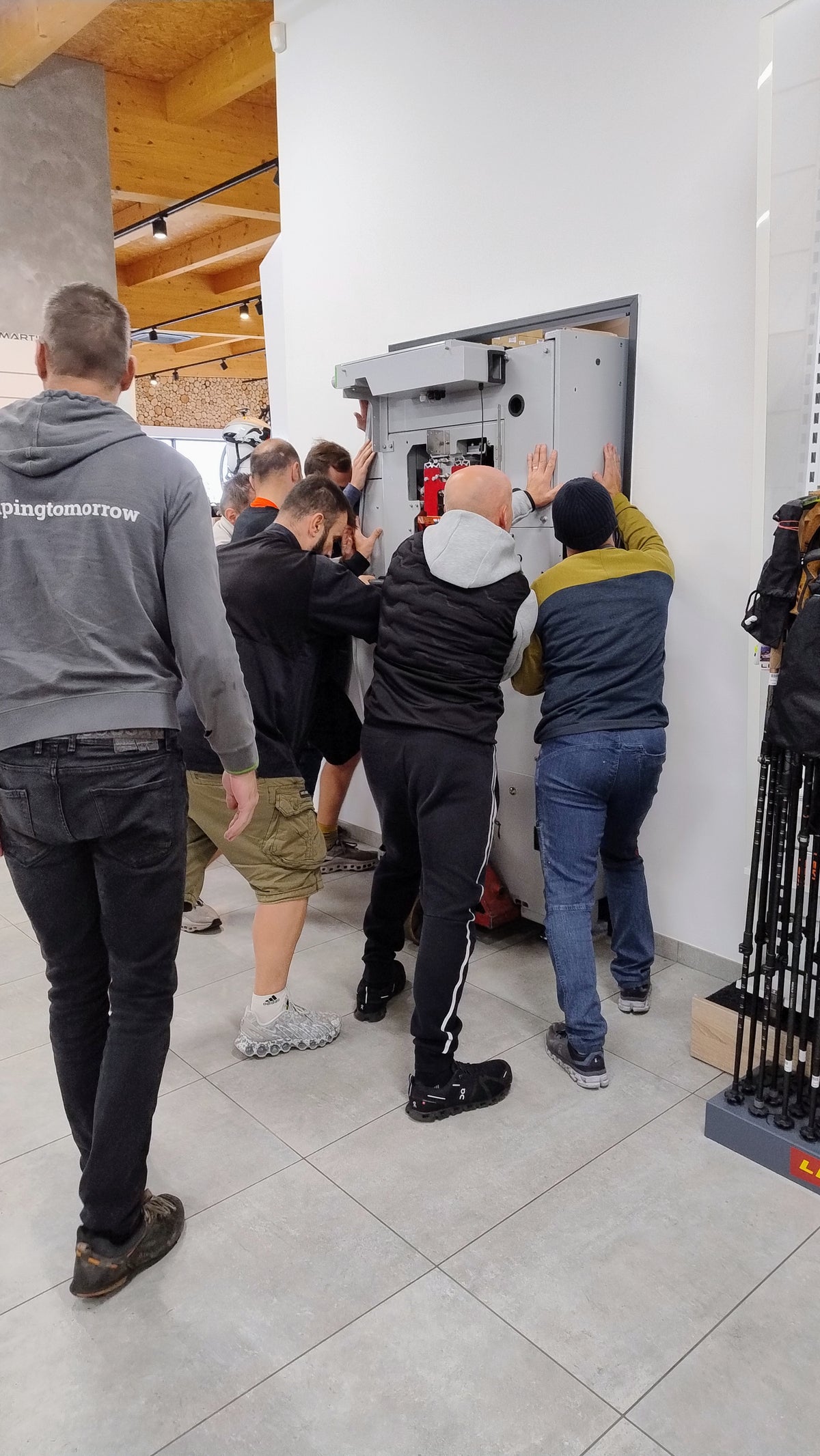 Dostat tak obří stroj k nám do prodejny nebylo jen tak. Když se nachýlil den D a nám se podařilo sehnat ještěrku, přijel kamion s bruskou zabalenou na několik kusů, které jsme začali stěhovat kus po kusu ven. Čekalo nás přesouvání, vybalování, přemisťování a stěhování od nejlehčích kusů až po brusku samotnou. No prostě zážitek na celý den!